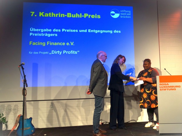 Fair Finance Germany member organisation Facing Finance recently had the honor of receiving the Kathrin Buhl Award. The prize, awarded by the Stiftung Nord-Süd-Brücken, recognized Facing Finance’s development-related projects that strengthen equal rights and participation and specifically the great work of the “Dirty Profits 10” project.